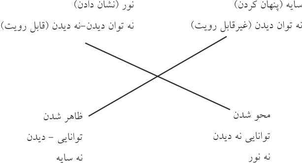 اگر بخواهيم مسئله نور را دقيقتر بررسي كنيم، بايد اذعان شود كه "نور" به عنوان يك ابژه معنا سازعمل مي كند. ابژهاي كه توسط تماشاگر مشاهده ميشود كه در واقع نمايش به او تحميل كرده و عامل موثر[4] ميگردد. بيننده نسبت به آن حساس و درك آن گاهي برايش دشوار است. اگر بخواهيم اصطلاح "ژنيناسكا" را در اين مورد به كار ببريم، ما با يك سميوز[5] (معنا سازي) در عمل سر و كار داريم كه فرم بيانش شكلهاي مختلف نور است (يكدست، فشرده، كوبنده، تابنده و غيره) و محتوايي آن مربوط به شناخت و حوزه حس-ادراكي نظارهگر آن نور است. نور چه نقشها و ارزشهايي را داراست؟