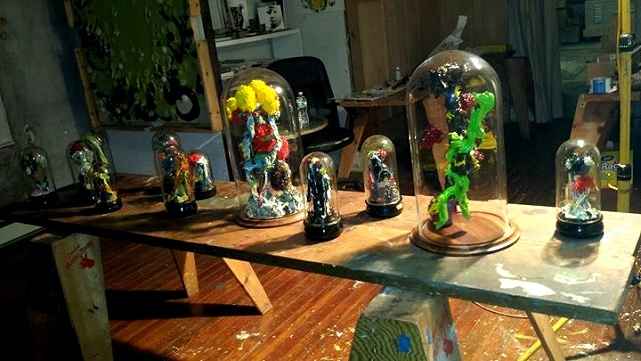 به گزارش بخش تجسمی آکادمی هنر و به نقل از وبسایت گالری Hionas، هنرمند در اینجا مجموعهای از مجسمههای جدید را ارائه میدهد، شامل یک مجسمهی بزرگ، متشکل از رنگ روغن چسباندهشده روی یک آرماتور چوبی. کارهای نمایشگاه میان ۲۰۰۸ تا ۲۰۱۵ خلق شدهاند. در چرخشی آشکار از شیوهی مرسوم هنرمند در استفاده از رنگ روغن در اشکال مجسمهسازانه، هولینگزوورث در این نمایشگاه، به جز دو مورد، از سطح بوم فاصله گرفته تا نقاشیهای سهبعدی و ایستادهای خلق کند که همانند مجسمه دیده میشوند. نتیجهی کار، ترکیبهای شگفتانگیزی است که مانند اشیای نادر در ویترین قرار داده شدهاند، و کیفیات طبیعتگرایانهی آنها در تضاد با ترکیبهای ماجراجویانه و کاربرد رنگماده در کار هنرمند قرار میگیرد. هنگامی که رنگ خشک میشود، نقاشی پایان مییابد. برای اینکه رنگ بالاتر از سطح بوم قرار بگیرد، بستر کار، که زمانی پانلها و کلافهای بوم بودند، تبدیل به آرماتورهای مجسمهسازی شدند.