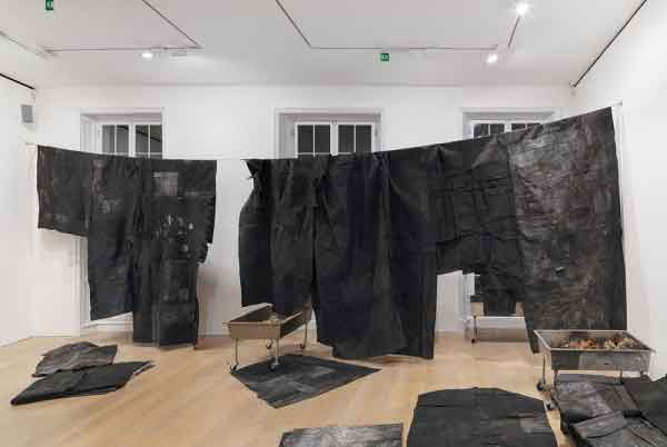 نقاشیهای بزرگ و ظاهرا دیوانهواری که موریلو با آنها شناخته میشود، به تدریج شکل میگیرند و اغلب شامل موادی هستند که در طول زمان تغییر میکنند، با بومهایی که در اطراف کارگاه هنرمند حرکت داده میشوند تا جای پا، اثر انگشت و غبار را به خود بگیرند. این نمایشگاه ادامهی تجربهی جدیدی در کار موریلو است که در آن، کارهایی با مدیومهای متفاوت در یک قاب پلاستیکی روشن در کنار هم قرار گرفته اند. با ترکیب تصاویر و مواد متنوع ــ شامل طراحیهای کوچک، چاپ و عکسهای شخصی ــ این ترکیببندیها با درجات متفاوتی با فرآیند نقاشی، طراحی، چاپ و اینستالیشن مرتبط هستند؛ بنابراین میتوان آنها را پیش درآمدهای بصری آثار حاضر در نمایشگاه و فرآیند کار موریلو دانست؛ هنرمند مرتبا از نقاشیهایش به عنوان طراحی یاد می کند، و در کارگاهش به صورت عمومی اشکال متفاوت چاپ را می آمیزد. در یک چیدمان جدید بزرگ در نمایشگاه، پارچه های سیاهی در طول گالری آویزان، روی هم انباشته، و در کنار میزها پهن شدهاند. بوم مجاور، که یکی از آثار مجموعهی جدیدی از کارهای فیگوراتیو موریلو است، نقاشی ای را به تصویر میکشد که وی در خانه ی یک مجموعه دار در بوگوتا دیده بود. این نقاشی پسر جوانی را در حال فروختن ماهی نشان میدهد. مشغولیت فیزیکی موریلو با مواد و متریال کارش جلوهای انسانگرایانه دارد، که به نوبه ی خود، چیدمان را در بستر چشمانداز اجتماعی ـ سیاسی کلمبیای پسااستعمار قرار می دهد.