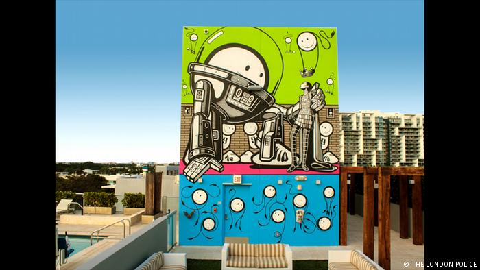 گروه بریتانیایی پلیس لندن ۲۰ سال پیش تشکیل شد. آنها با خلق شخصیت آدمکی سفید با کلهای گرد به شهرت جهانی رسیدند. بعد از فراز و نشیبهای زیاد دو مؤسس اصلی گروه دوباره شروع به همکاری با یکدیگر کردند، به این صورت که چز مسئول کشیدن این آدمکهاست و باب گیبسون دنیای تخیلی اطرافشان را نقاشی میکند. این تصویر اثری مشترک از این دو هنرمند است که در سال ۲۰۱۴ در حاشیه نمایشگاه هنر بال (بازل سویس) خلق کردند.